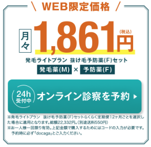 予防プラン12か月プランのお薬代が適用となります。予約ページのコード欄に必ず「docfina」とご入力ください。おー人様一回限り。 - 【発毛ライトプラン:コード適用条件】