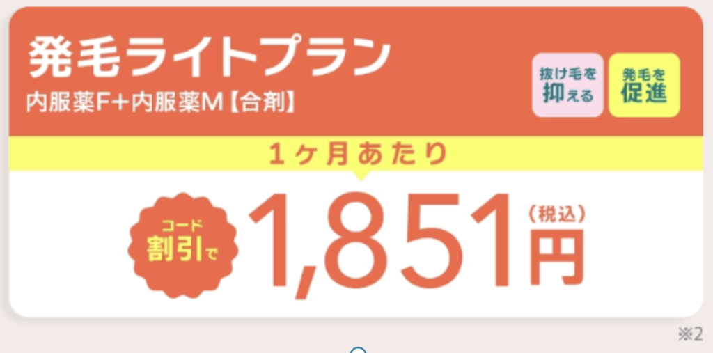 | 【発毛ライトプラン】【合剤】※1 ・フィナステリド ・ミノキシジル内服 | ・1ヵ月:9,702円 ・定期配送:5,361円~ ※初回クーポン利用時 |
