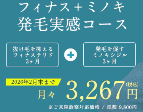 | 発毛実感コース | フィナステリド+ミノキシジル(3ヶ月分) | 9,800円 (1ヶ月あたり約3,267円) |